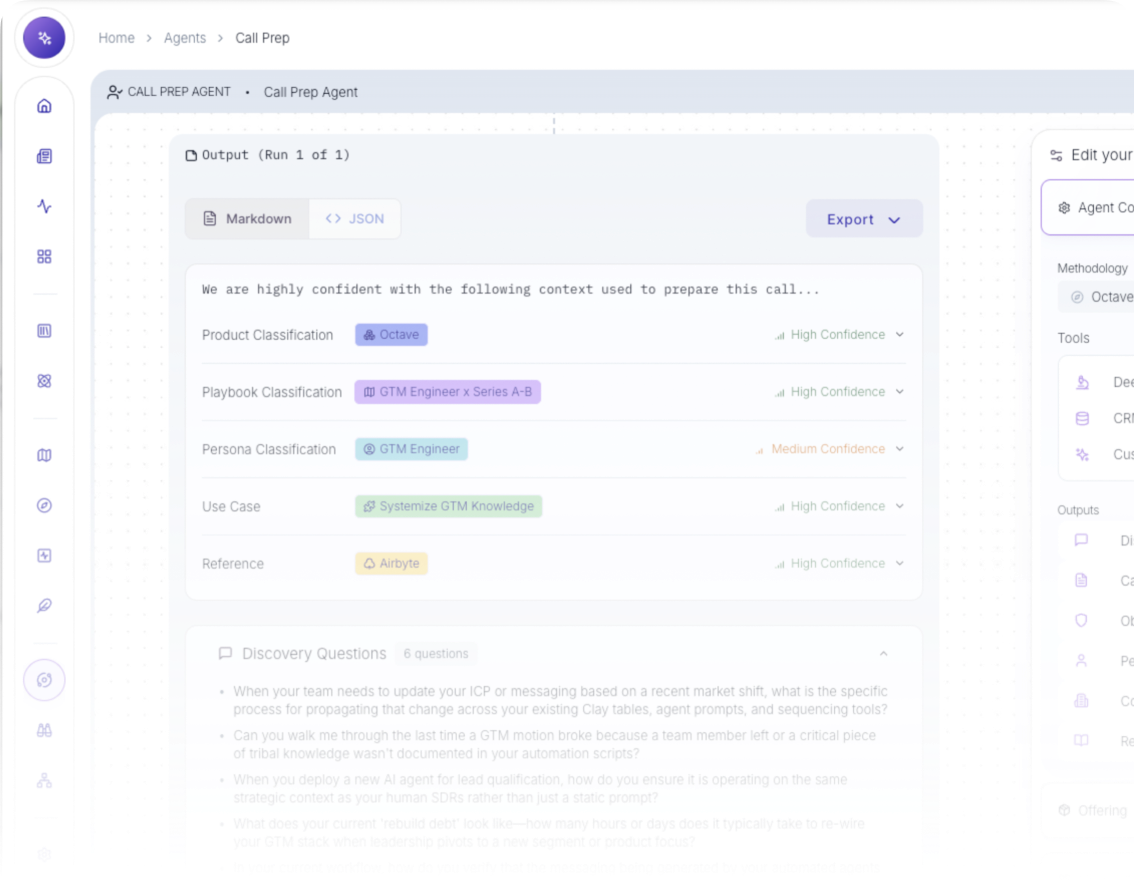 Octave delivers your messaging, positioning, buyer insights, and ICP intelligence to your people, agents, and workflows. Wherever your team executes, the full depth of your strategy is already there.